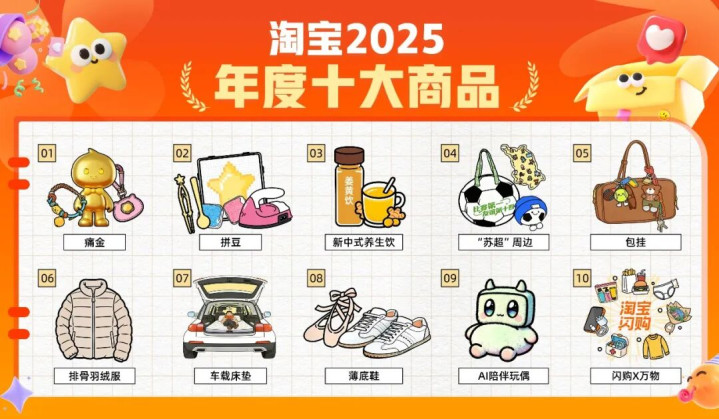 最近,2025淘宝年度十大商品榜单新鲜出炉:痛金、拼豆、包挂、新中式养生饮、薄底鞋、车载床垫、排骨羽绒服、AI陪伴玩偶、“苏超”周边、闪购x万物脱颖而出。